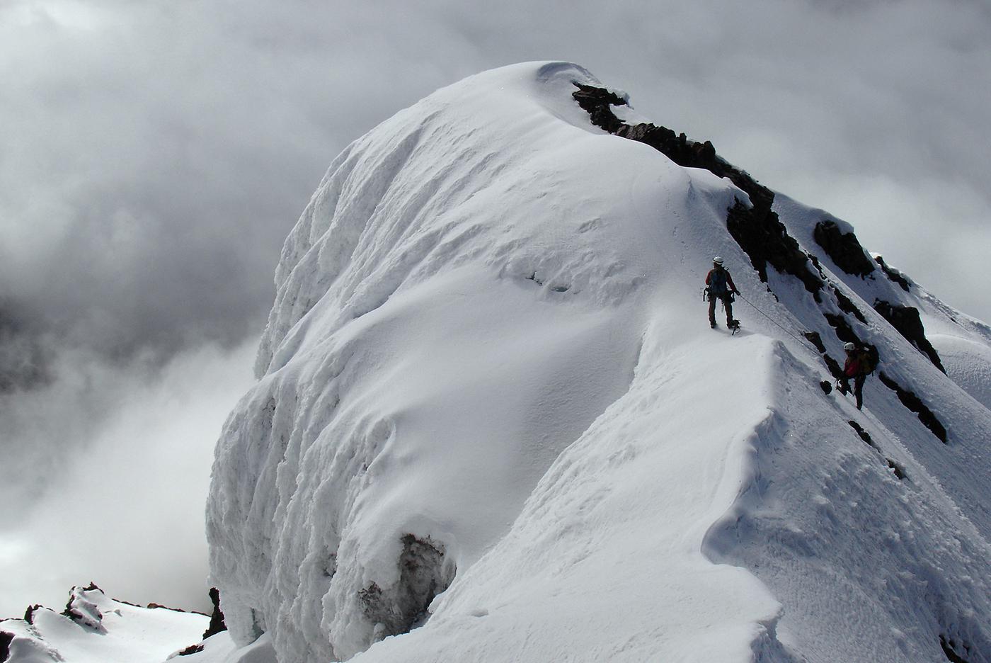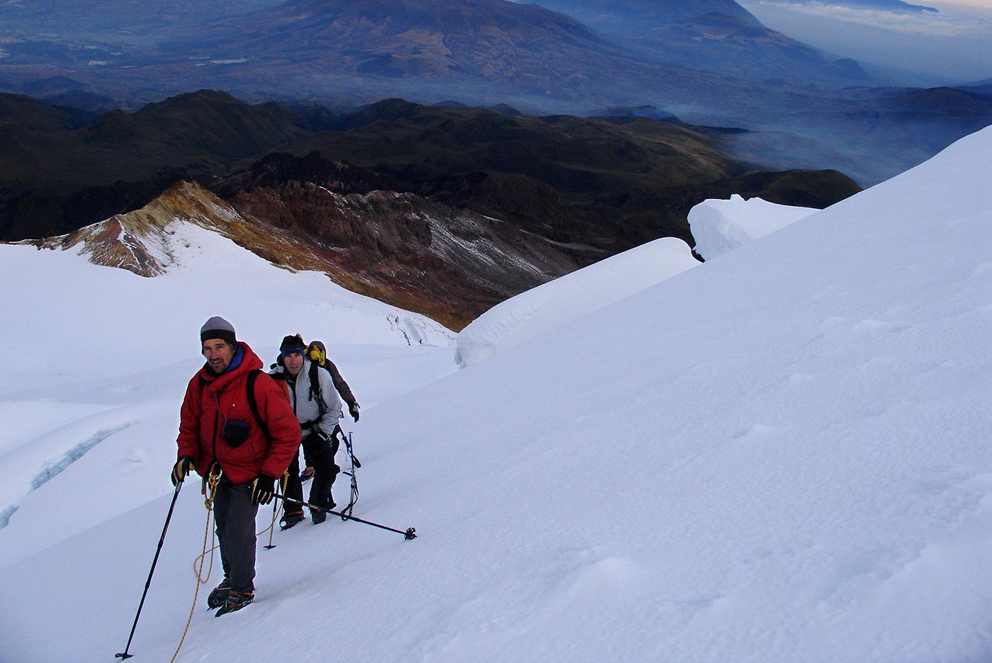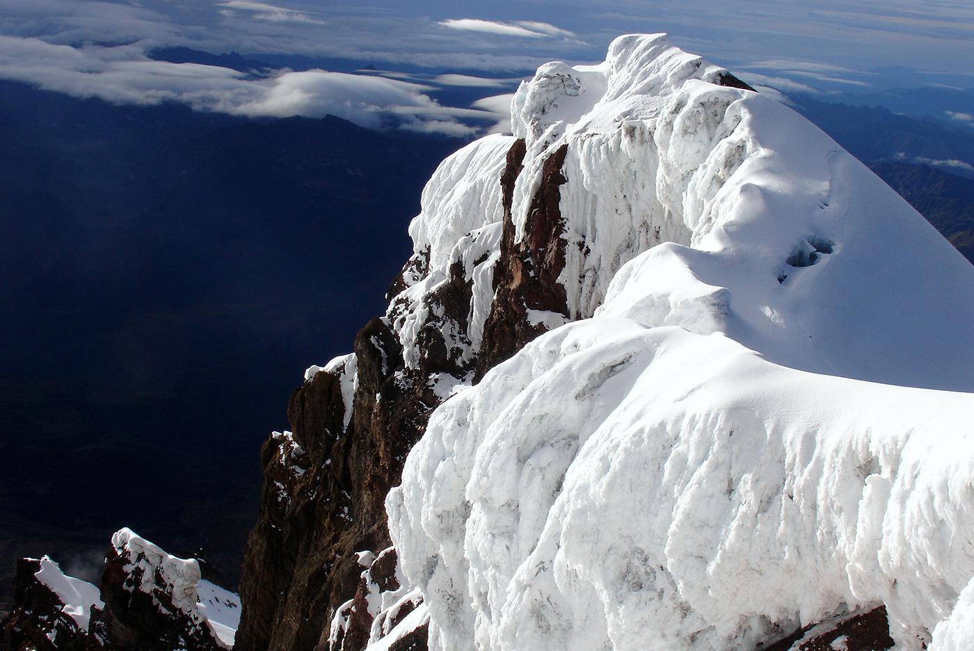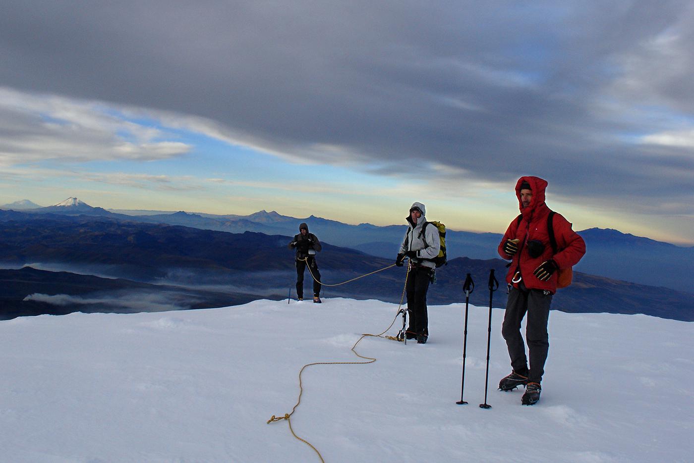 En 2006, envoyés par l'Ensa dans le cadre d'un échange avec l'association des guides équatoriens, nous avions été suivre une formation avec Bruno, Pierre et François. Nous nous sommes d'abord acclimatés le lendemain de notre arrivée comme on a pu sur la voie normale du Cayambe (5785 m) et ses crevasses crachant le souffre pour ensuite collaborer avec les formateurs locaux à la mise en place d'un examen probatoire destiné aux candidats au cursus de guide. Après avoir visité quelques petites arêtes et parois rocheuses propices à de futurs stages, nous avions gravi avec les formateurs équatoriens l'arête sud de l'Antisana (5753 m), une voie qui sans être très difficile techniquement m'avait paru atypique et engagée.