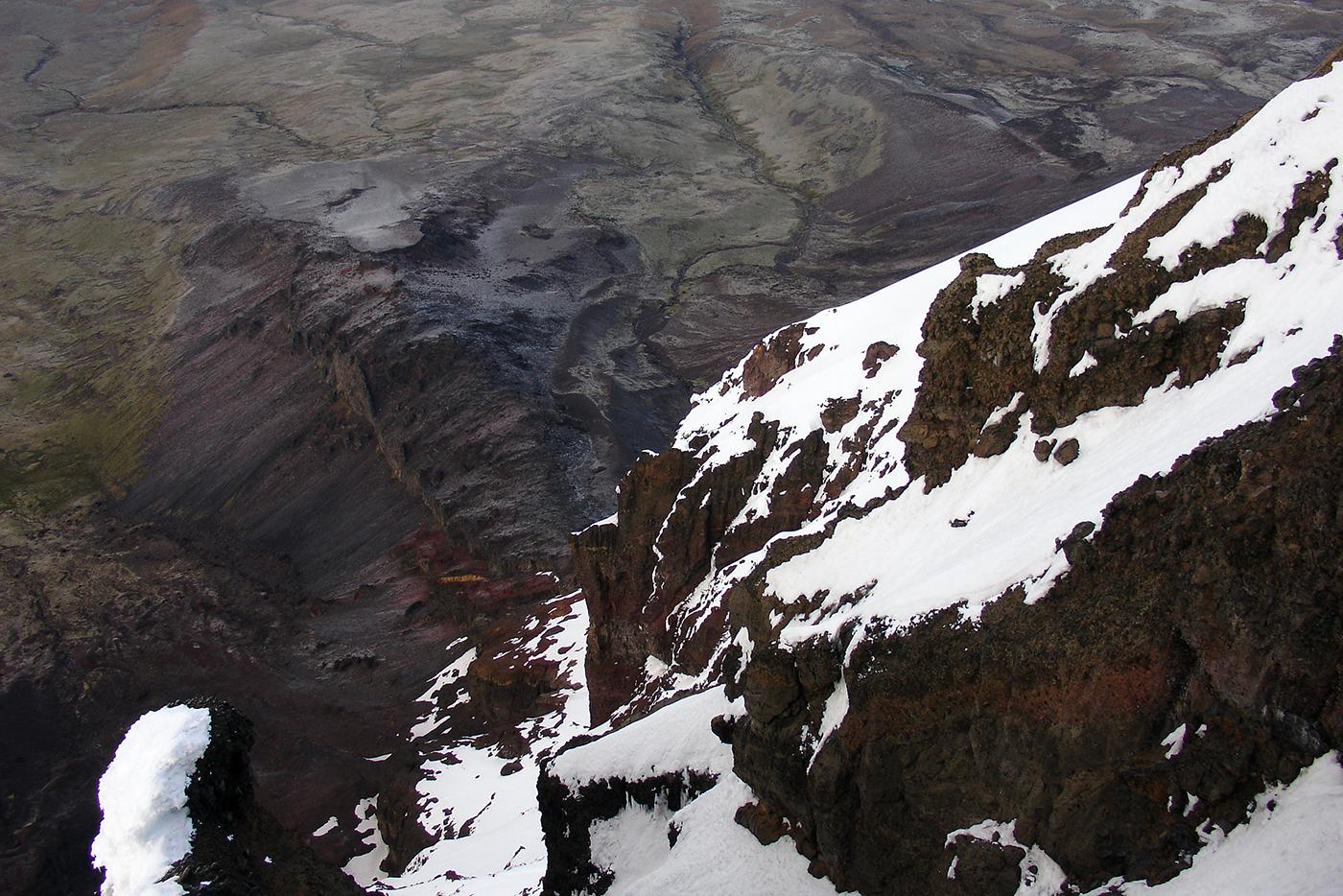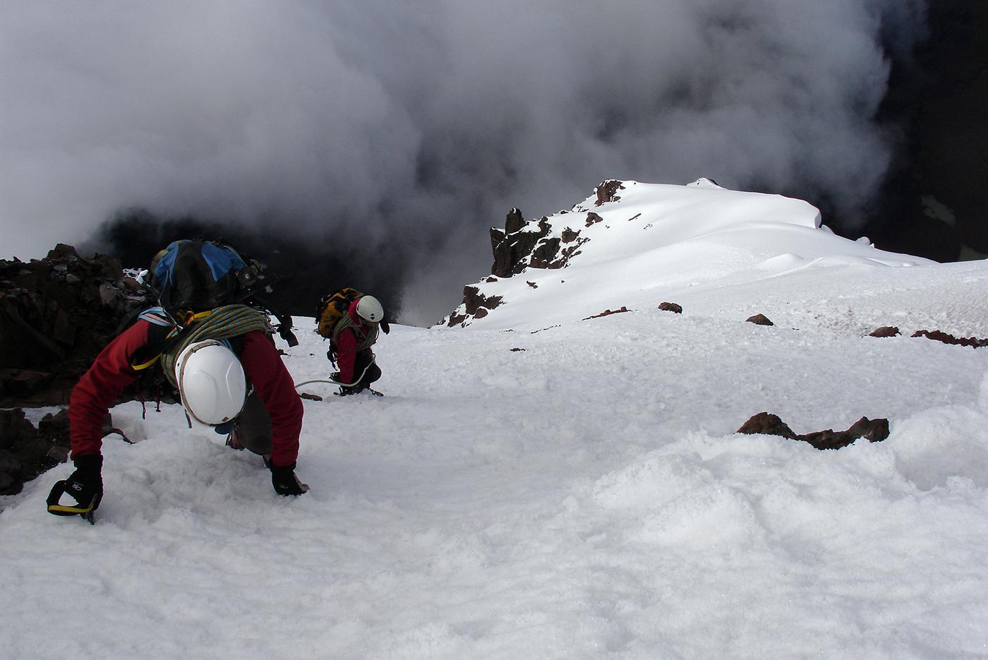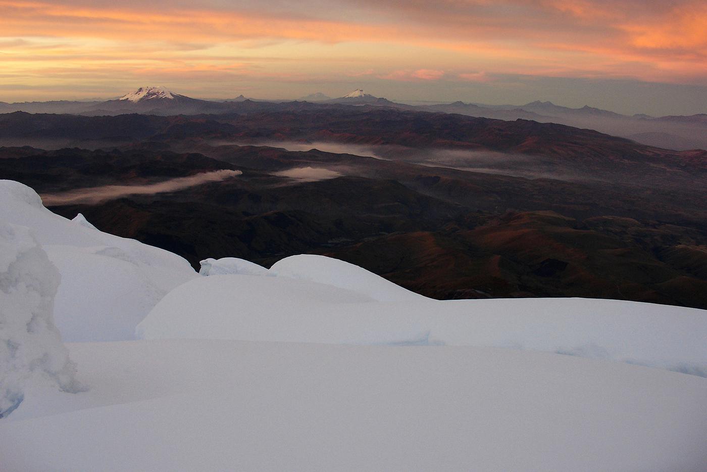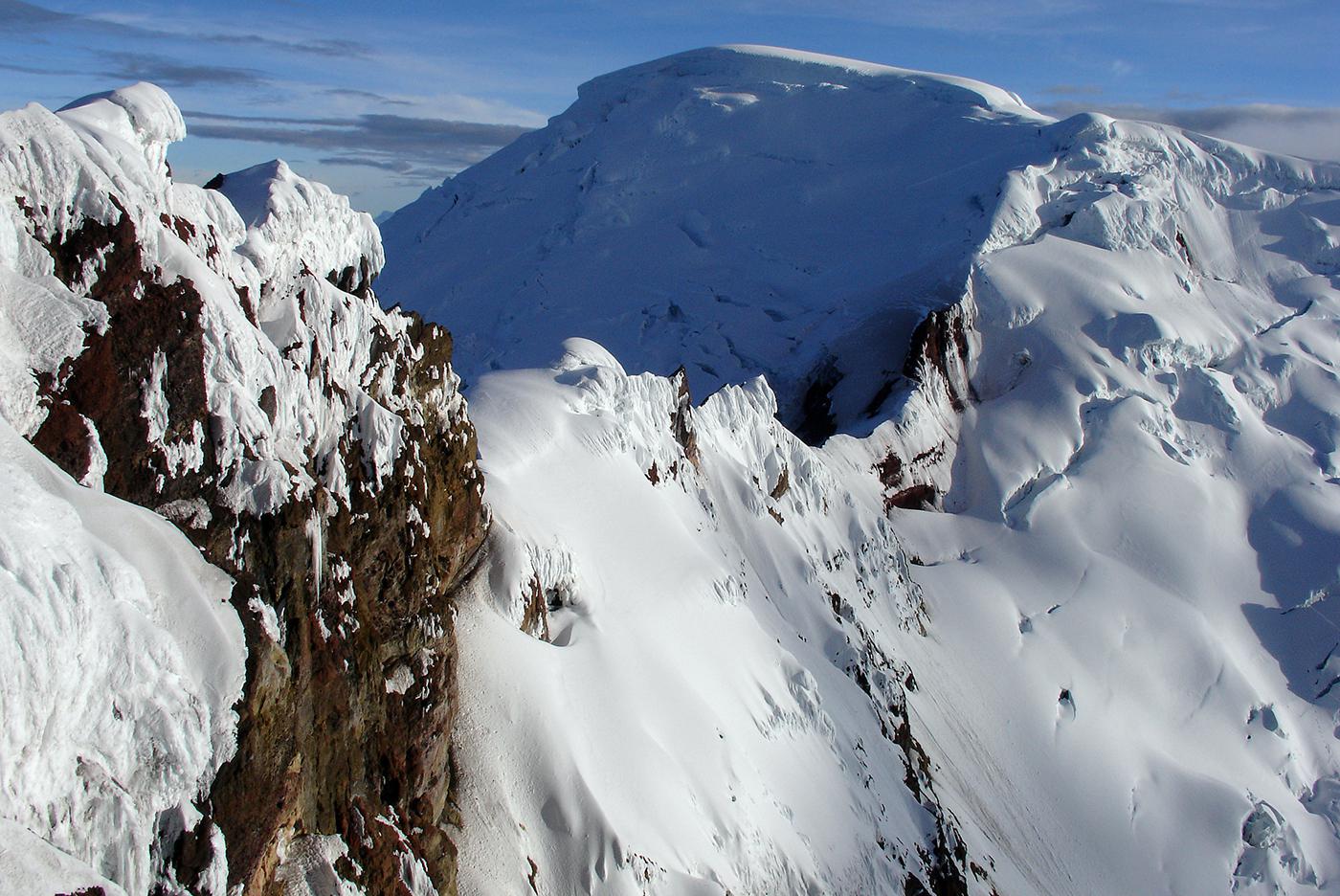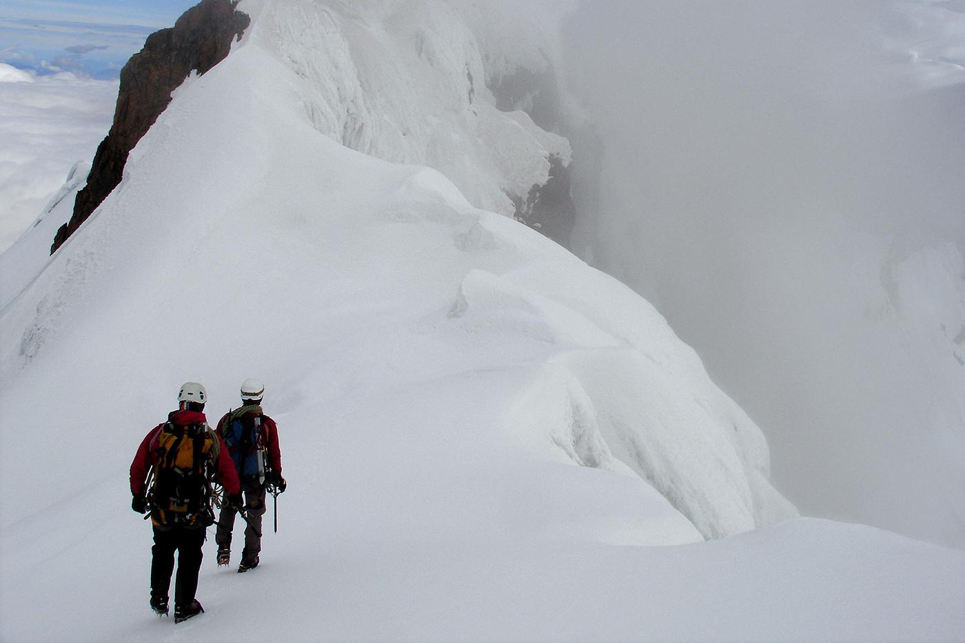 En 2006, envoyés par l'Ensa dans le cadre d'un échange avec l'association des guides équatoriens, nous avions été suivre une formation avec Bruno, Pierre et François. Nous nous sommes d'abord acclimatés le lendemain de notre arrivée comme on a pu sur la voie normale du Cayambe (5785 m) et ses crevasses crachant le souffre pour ensuite collaborer avec les formateurs locaux à la mise en place d'un examen probatoire destiné aux candidats au cursus de guide. Après avoir visité quelques petites arêtes et parois rocheuses propices à de futurs stages, nous avions gravi avec les formateurs équatoriens l'arête sud de l'Antisana (5753 m), une voie qui sans être très difficile techniquement m'avait paru atypique et engagée.