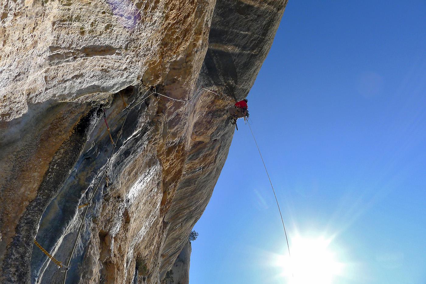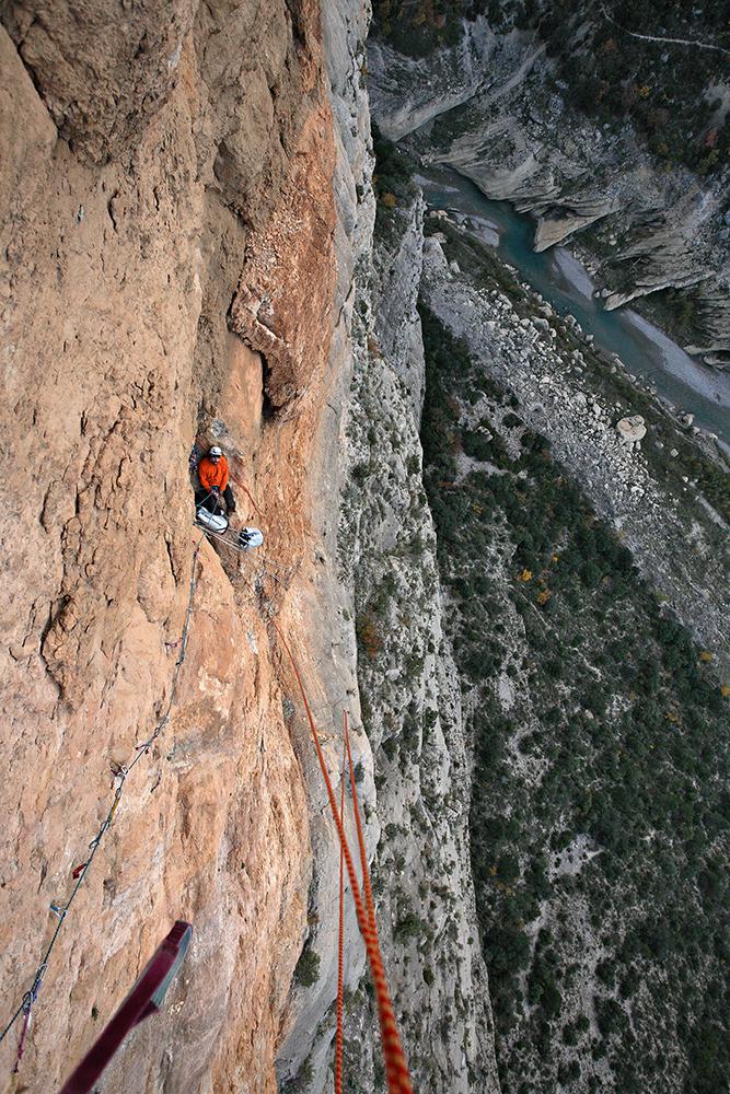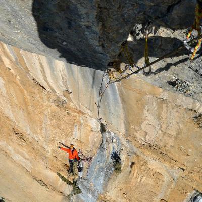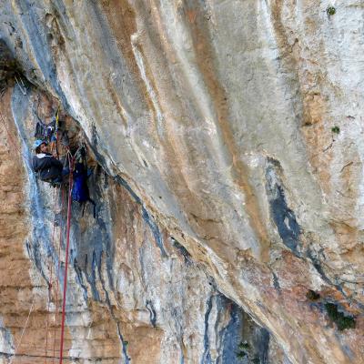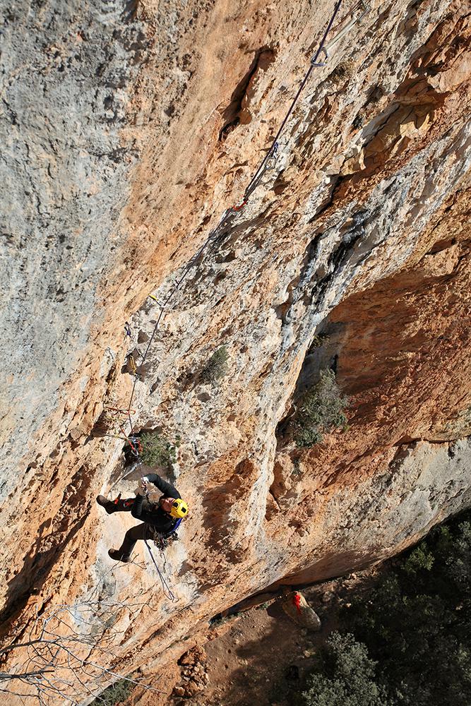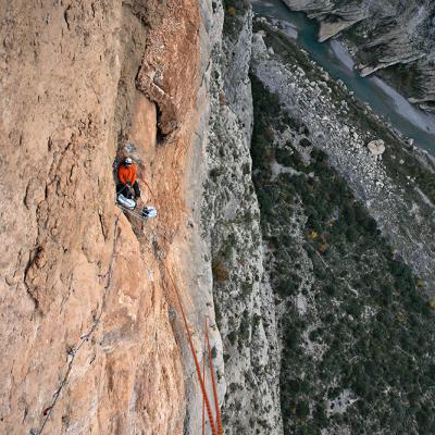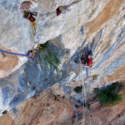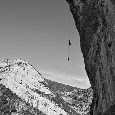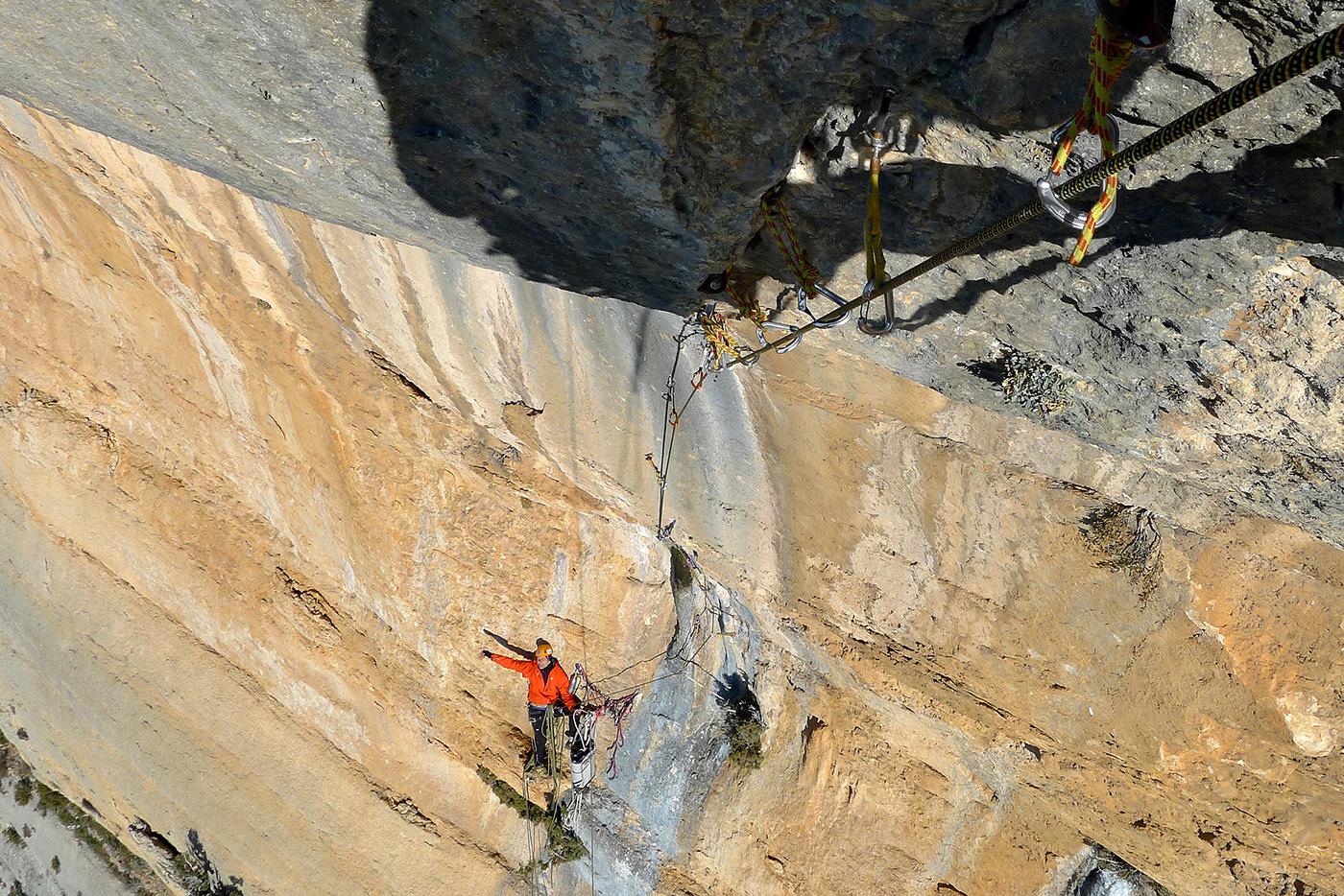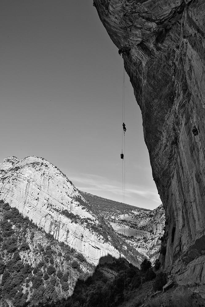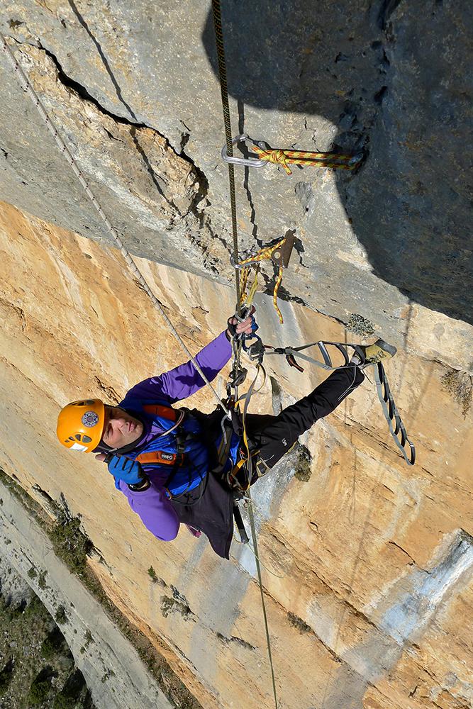 L'escalade artificielle consiste à grimper sur des parois surplombantes où l'escalade en libre serait trop difficile. On progresse de point à point, d'étrier en étrier, en mettant son propre équipement : pitons, crochets, plombs, cales de bois, friends, coinceurs, etc. Il est parfois compliqué de trouver une solution pour mettre un point et continuer à s'élever. Ainsi, plus les protections que l'on met sont précaires, plus la cotation de la longueur augmente. Cette escalade change notre rapport habituel au temps tant la progression est souvent lente et technologique. C'est une bonne opportunité pour s'immerger complètement dans les ambiances de parois et aussi de vivre de longs voyages quand on part dans une voie nécessitant des bivouacs. La plupart de ces photos sont issues de différents stages "d'artif" à Vilanova de Meià.
