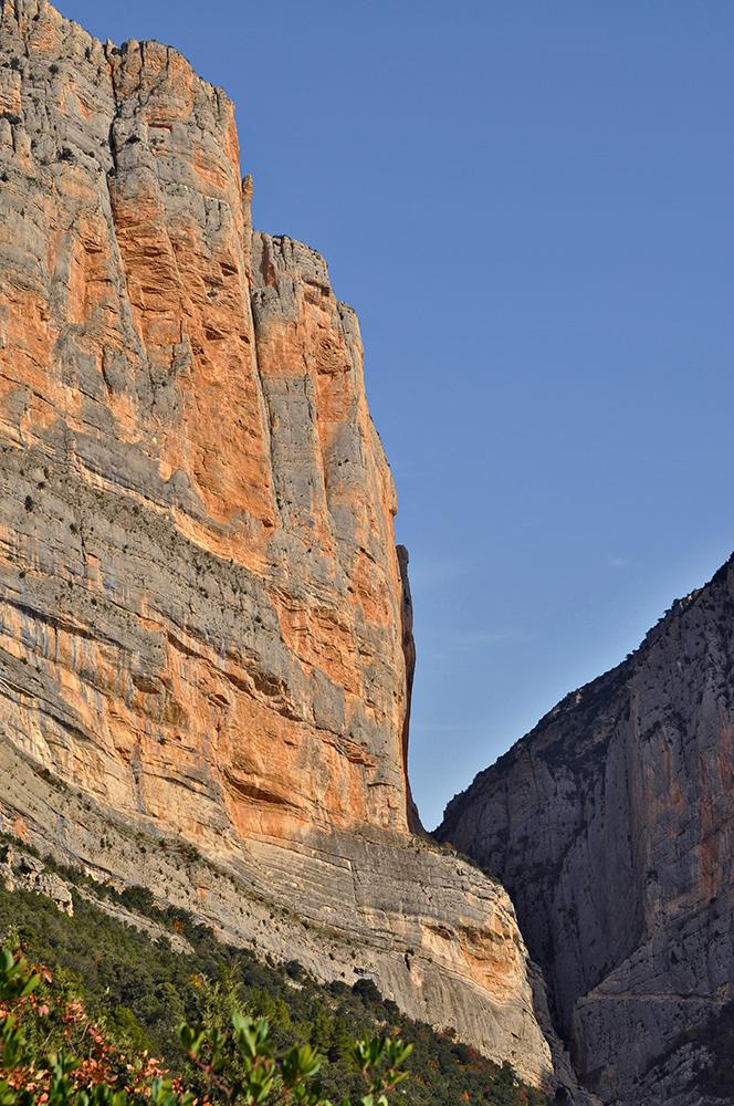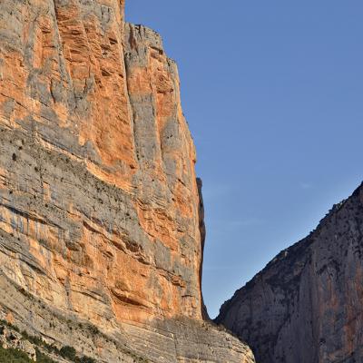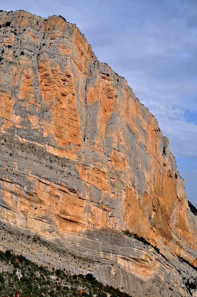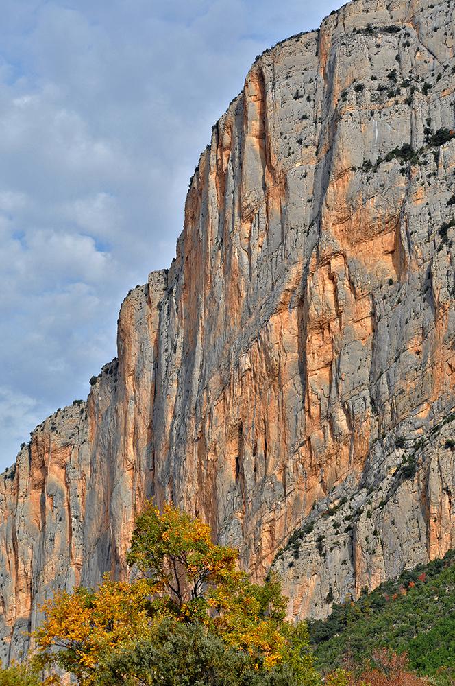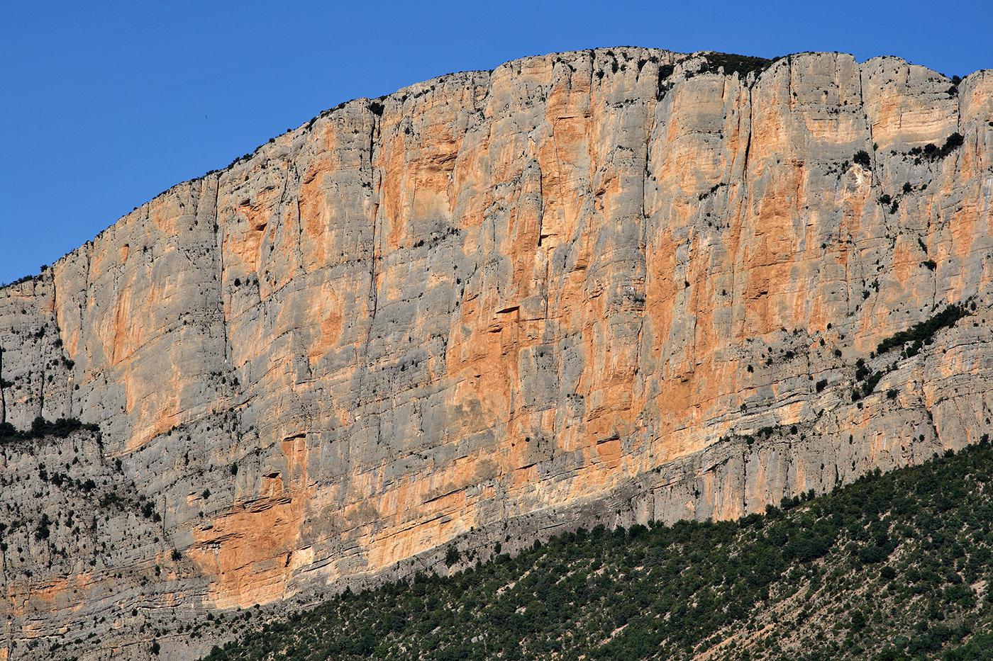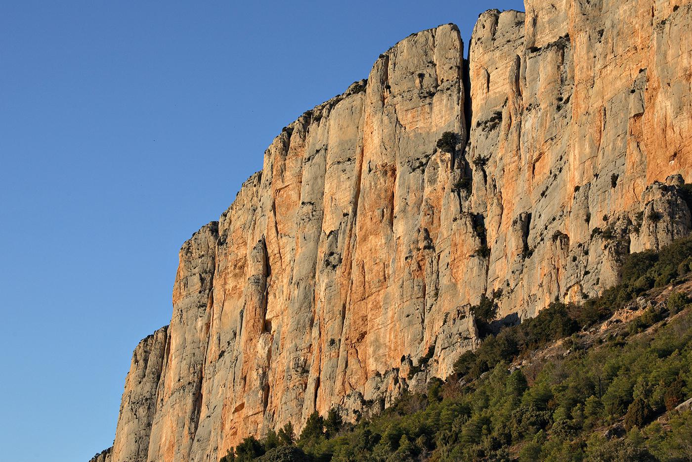 Les parois de Montrebey se trouvent à la frontière de l'Aragon et de la Catalogne, divisées par la Noguera Ribagorzana et le lac de Canelles dans lequel elles plongent. Ce sont les murailles les plus hautes de ces deux régions, jusqu'à plus de 500 mètres. Terre confidentielle et de liberté pendant longtemps pour les grimpeurs, les têtes pensantes de la Fundació Catalunya-La Pedrera, sous prétexte d'en préserver l'espace, en ont fait peu à peu depuis une quinzaine d'années une sorte de Luna Park du plein air, engendrant une sur-fréquentation notoire (200 000 personnes en 2019), engendrant elle-même des problèmes de pollution... justifiant ainsi la mise en place de parkings payants afin de subvenir aux frais de nettoyage du site. Le tour de passe-passe du tourisme moderne était joué, au grand dépit des grimpeurs devenus persona non grata même si l'escalade n'y est pas encore totalement interdite. Les parois demeurent et je vous en propose quelques clichés.